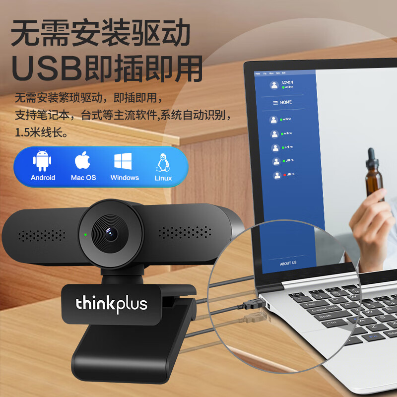 联想thinkplus电脑摄像头USB500万像素2K高清带麦克风家用网课直播视频会议台式机外置摄像头WL24A价格:139.00元!
