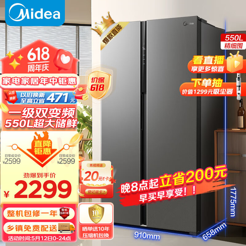 美的(Midea)550升一级能效双变频对开门双开门家用智能电冰箱节能无霜净味超薄嵌入BCD-550WKPZM(E)大容量价格:2499.00元!