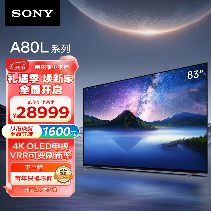 索尼(SONY)83英寸 4K OLED智能电视 自发光 屏幕发声 XR认知芯片 游戏增强器 屏设计 XR-83A80L价格:28999.00元!