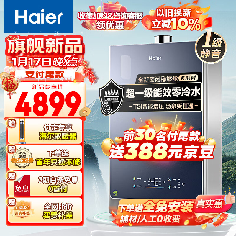 海尔(Haier)16升燃气热水器天然气超一级能效 无极变频水伺服 五段微火控温 TSI增压 JSLQ27-16KLN-ECO7FLRGU1价格:4899.00元!