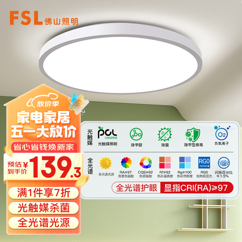 FSL佛山照明全光谱护眼吸顶灯光触媒卧室灯豁免级蓝光Ra97绅士白25W价格:199.00元!