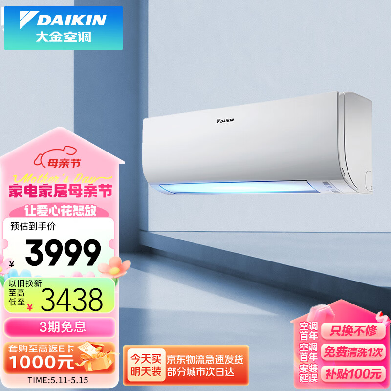 大金空调 14-19㎡适用 新三级能效 大1.5匹 变频 冷暖 家用 壁挂式 以旧换新 FTXJ336WC-W价格:3999.00元!