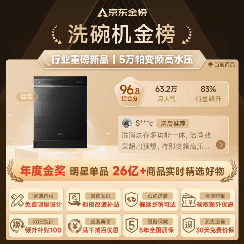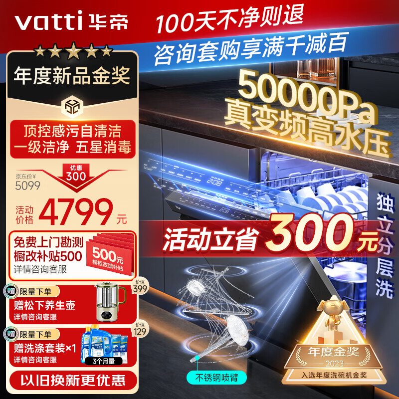 华帝(VATTI)15套变频50000Pa高压洗碗机嵌入式 超一级水效五除菌家用热烘独立分层洗 瀚海系列全域洗iD13价格:4799.00元!