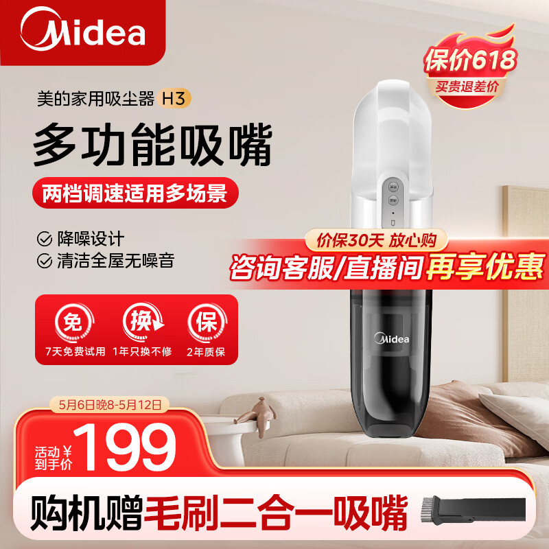 美的(Midea)H3手持无线吸尘器 小巧便携 大吸力长续航 水洗尘杯 随手吸尘器价格:199.00元!