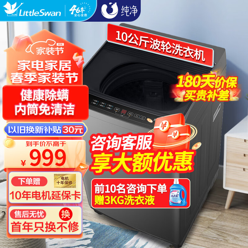 小天鹅(LittleSwan)洗衣机全自动波轮 10公斤大容量节能省水省电宿舍租房家用快洗除螨 以旧换新TB100V23H-1价格:969.00元!