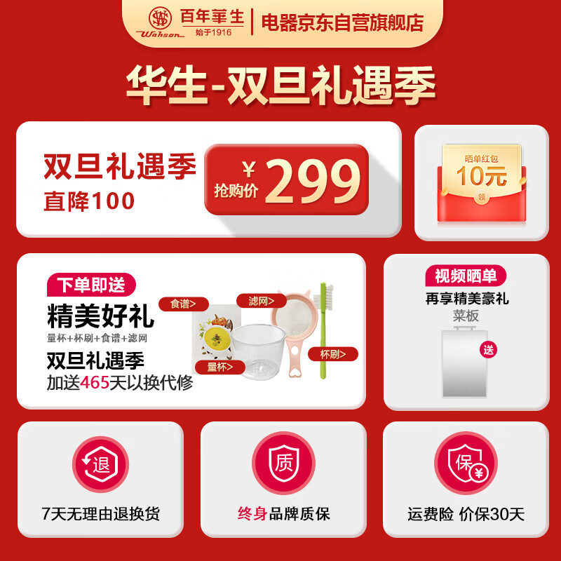 华生(Wahson)破壁机家用免煮五谷杂粮低音多功能豆浆机免过滤榨汁料理辅食机1.75L大容量WS-879价格:299.00元!