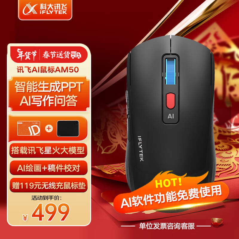 科大讯飞 AI智能鼠标AM50 无线鼠标 蓝牙鼠标 AI写作问答 智能生成PPT 无线充电 办公鼠标 黑色价格:499.00元!