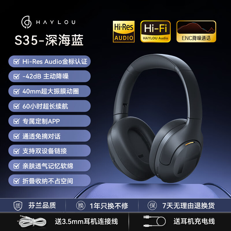 嘿喽(Haylou)S35 ANC头戴式耳机 42dB深度降噪跑步运动音乐无线蓝牙耳机 有线带麦克风电竞耳机 送男女友价格:249.00元!
