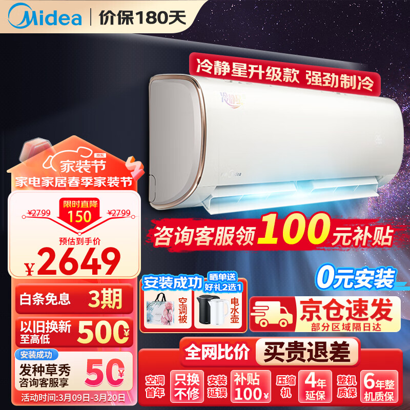 美的(Midea)空调1.5匹 冷静星二代新一级能效变频冷暖自清洁家用壁挂式空调挂机 KFR-35GW/BDN8Y-PH200(1)A价格:2649.00元!