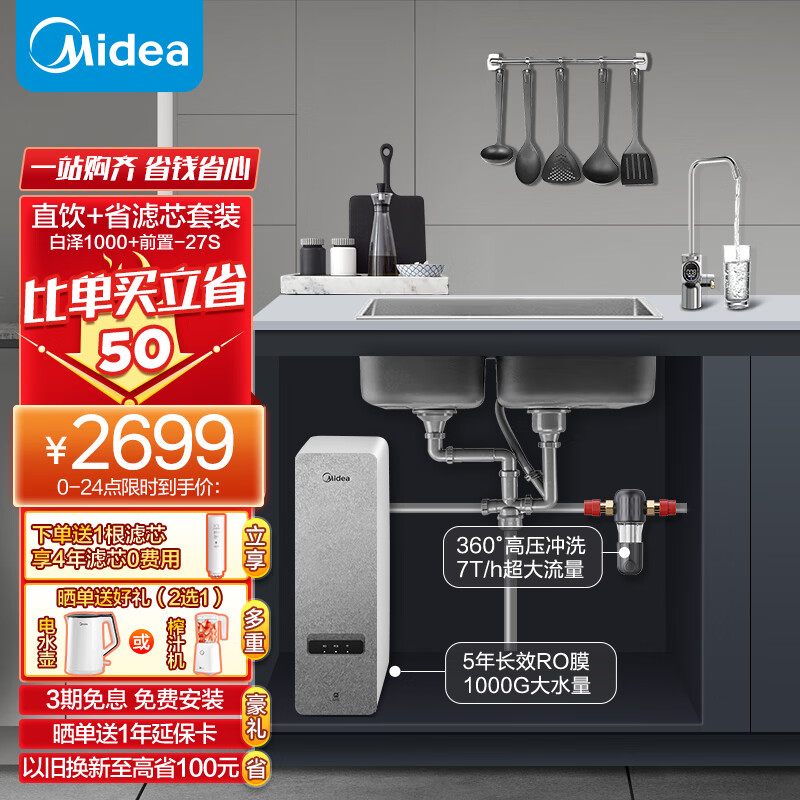 美的(Midea)省芯直饮净水器套装【白泽1000+前置过滤器-27s】厨下式双出水龙头 RO反渗透家用一体净饮机价格:2699.00元!