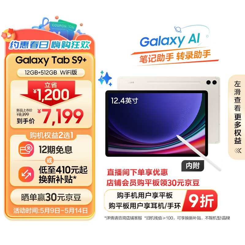 三星(SAMSUNG)S9+ Al智享学习办公平板电脑12.4英寸骁龙8Gen2 120Hz 12G+512GB WIFI版 AI平板 云雾金价格:7199.00元!