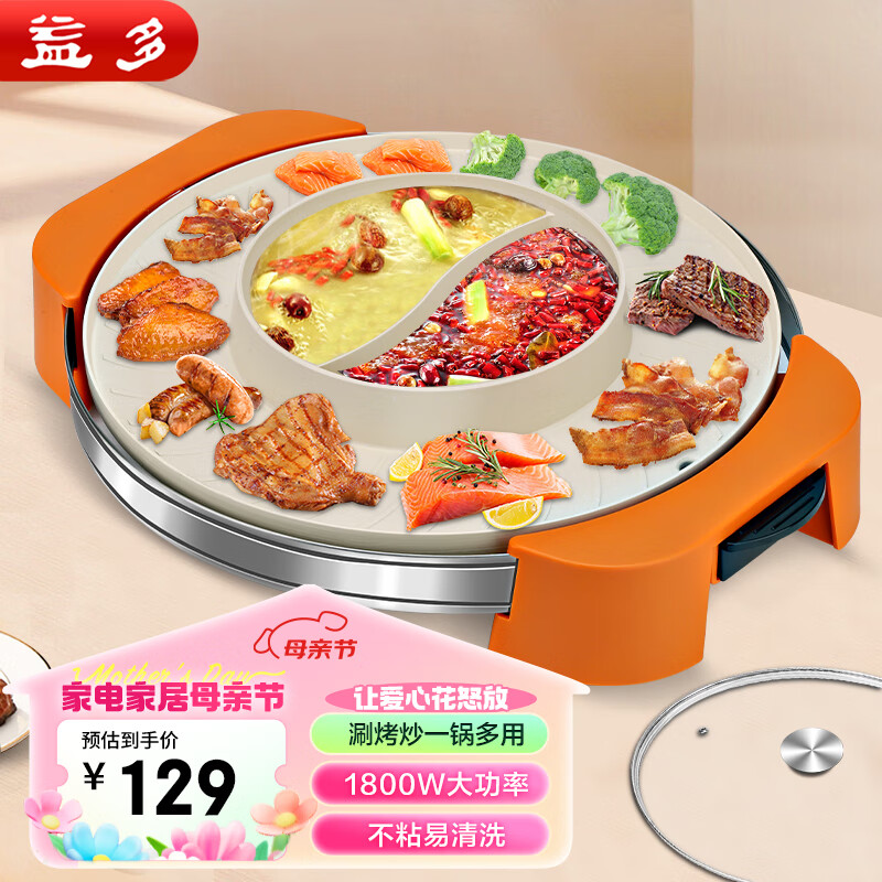 益多多功能涮烤一体锅家用插电烧烤炉麦饭石不粘烤肉锅鸳鸯锅电热火锅 SS-46A价格:129.00元!