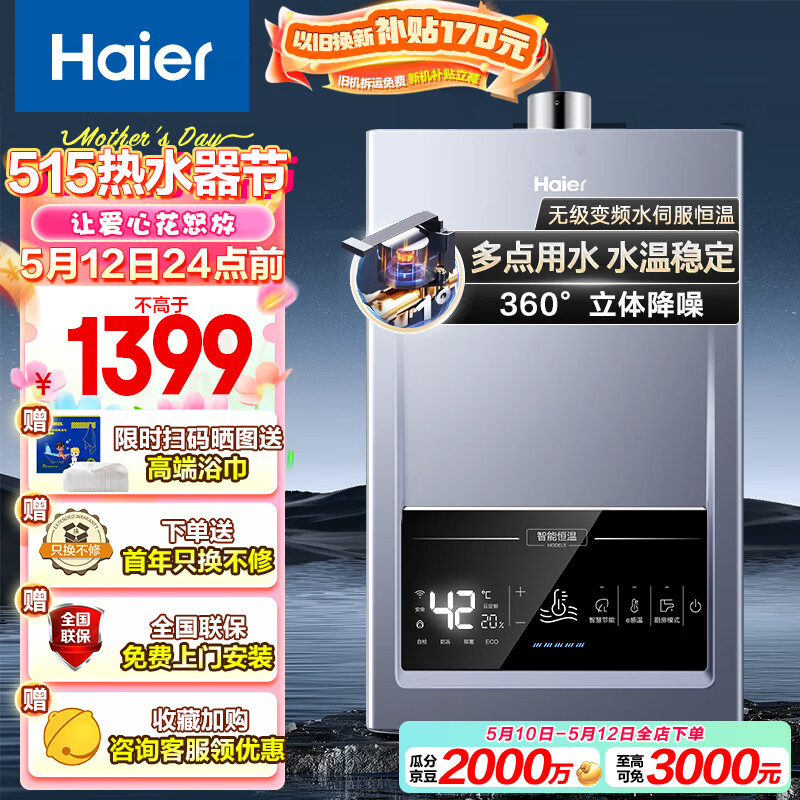 海尔(Haier)16升燃气热水器天然气 无级变频水伺服恒温 静音降噪 智慧节能 低水压启动JSQ30-16MODEL5(12T)U1价格:1393.00元!