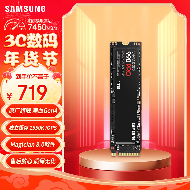 三星(SAMSUNG)1TB SSD固态硬盘 M.2接口(NVMe协议PCIe 4.0 x4) 990 PRO (MZ-V9P1T0BW)价格:719.00元!