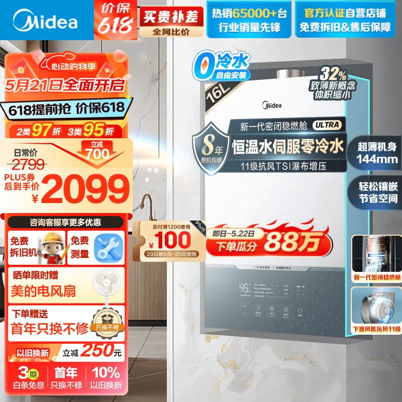 美的(Midea)16升燃气热水器 天然气 恒温水伺服 零冷水 TSI增压 抗风 新一代密闭稳燃舱 JSQ30-MATE Ultra无相价格:2399.00元!