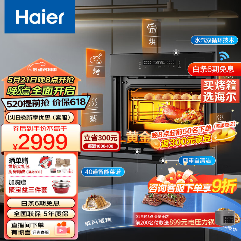海尔(Haier)嵌入式蒸烤箱 蒸烤一体机 50L蒸烤烘炸炖五合一 温湿精控 余水单独回收 搪瓷内胆自清洁C50-TAU1价格:3299.00元!