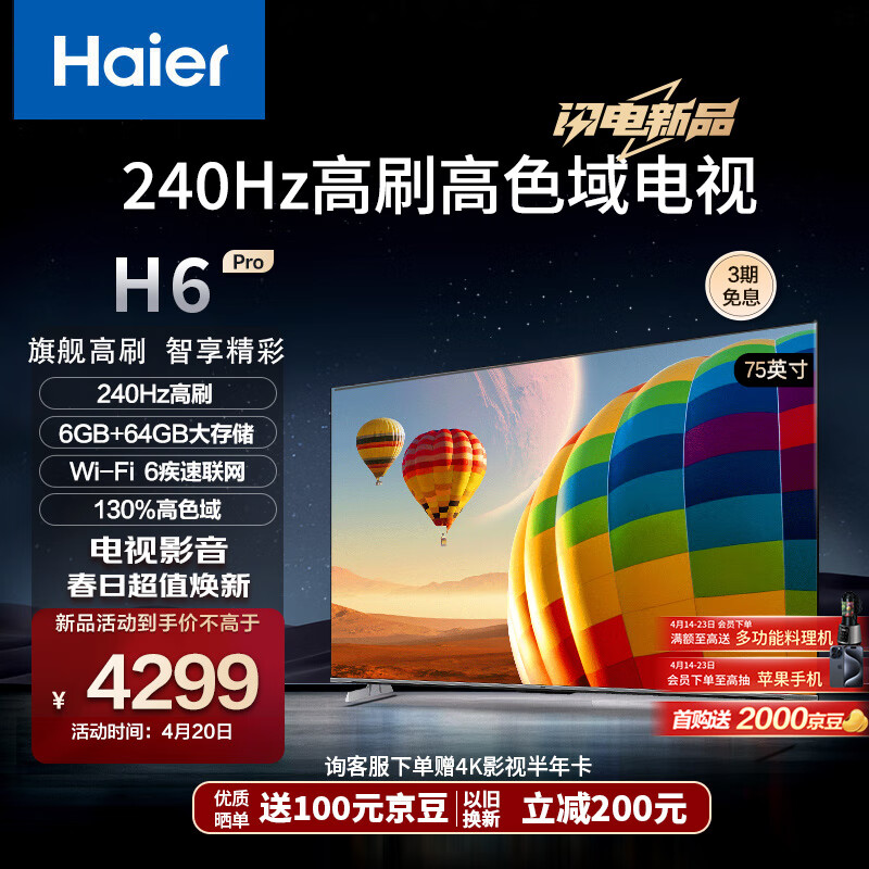 海尔(Haier)75H6 Pro 75英寸电视 4K超高清240Hz屏 6+64GB 大屏电视智能液晶平板电视机以旧换新价格:4299.00元!