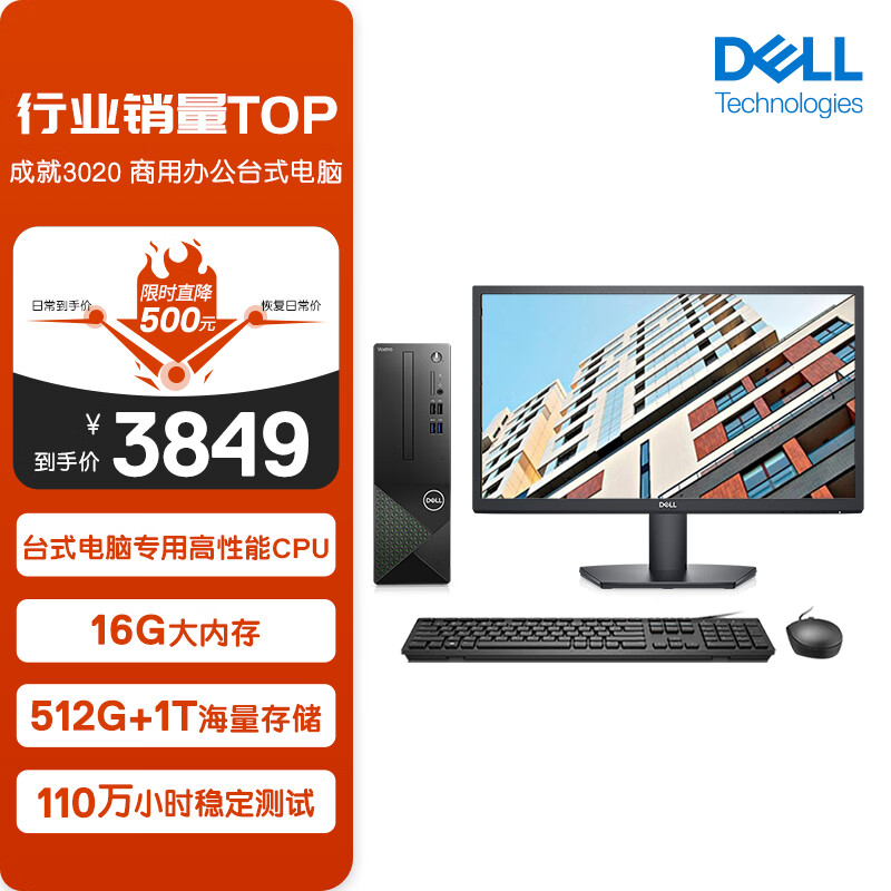 戴尔(Dell)成就3020 台式电脑主机(酷睿13代i5-13400 16G 512GSSD+1TB)21.5英寸显示器 高性能CPU价格:3849.00元!