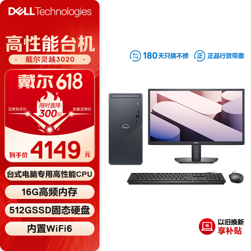 戴尔(DELL)灵越3020 台式电脑主机 (酷睿13代i5-13400 16G 512GSSD)21.5英寸显示器 高性能CPU价格:4149.00元!