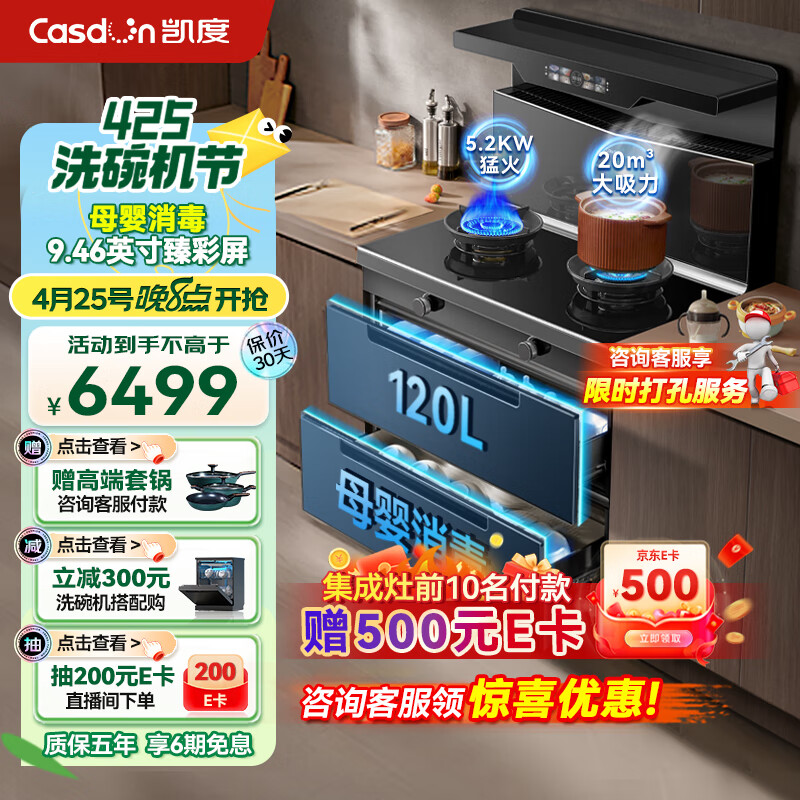 凯度(CASDON)集成灶消毒集成灶一体式集成燃气灶侧吸式抽油烟机一体机 变频5.2kw火力120L双抽 X02天然气价格:7499.00元!