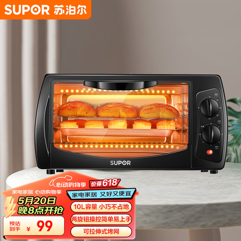 苏泊尔(SUPOR)家用多功能电烤箱 定时控温双控制 10L迷你光波加热小烤箱家用易操作 玄英黑 K10FK810价格:109.00元!