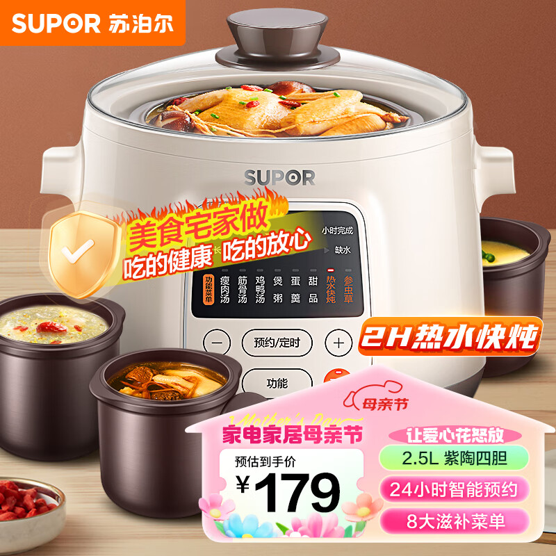 苏泊尔(SUPOR) 电炖锅 电炖盅 电砂锅 煲汤炖汤锅 紫砂锅 隔水炖 燕窝炖盅 煮粥神器 辅食电煮锅DZ25YC606 2.5L价格:179.00元!