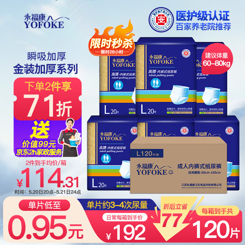 永福康 成人拉拉裤金装加厚L120片老人尿不湿 孕产妇内裤型纸尿裤价格:161.00元!