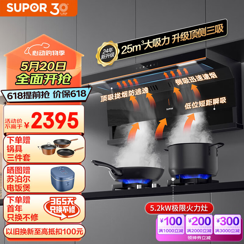 苏泊尔(SUPOR)抽油烟机 双腔拢烟顶侧双吸油烟机灶具套装 25立方大吸力变频烟灶 家用油烟机燃气灶 DL35+DB27液价格:2395.00元!