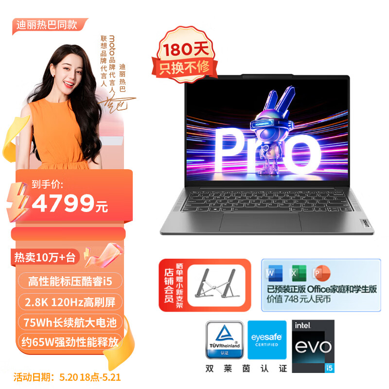 联想笔记本电脑小新Pro14超能本 高性能标压英特尔酷睿i5 14英寸轻薄本 16G 1T 2.8K高刷护眼屏 灰价格:4799.00元!