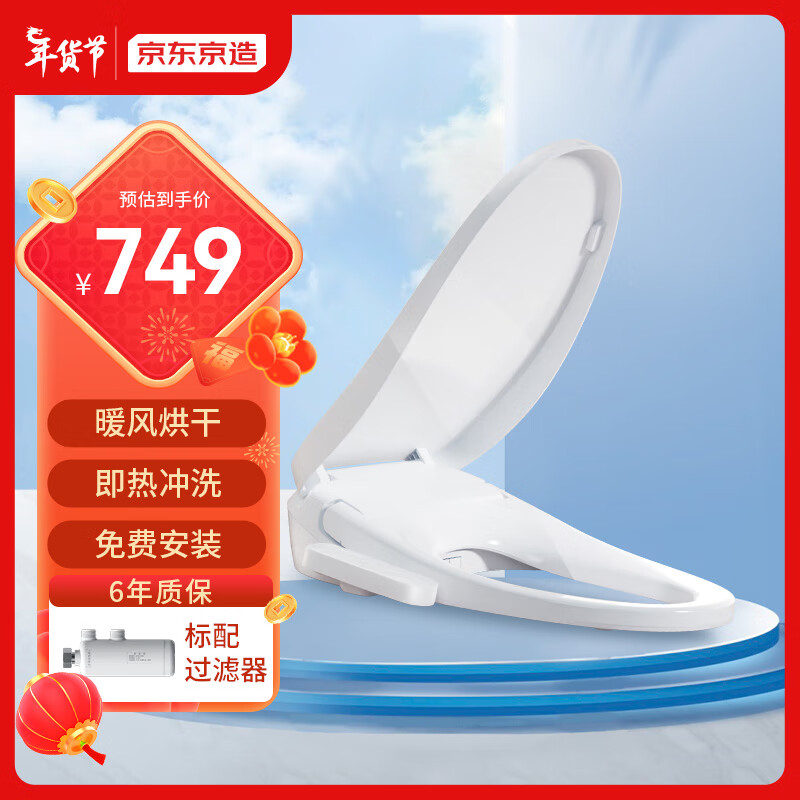 京东京造小海豚智能马桶盖 暖风烘干 活水即热清洗? 座圈加热 含安装价格:749.00元!