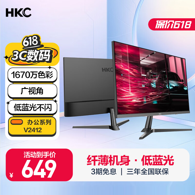 HKC 23.8英寸 IPS面板 高清屏幕1080P 低蓝光不闪屏 广视角 HDMI接口 办公家用 电脑液晶显示器V2412价格:649.00元!