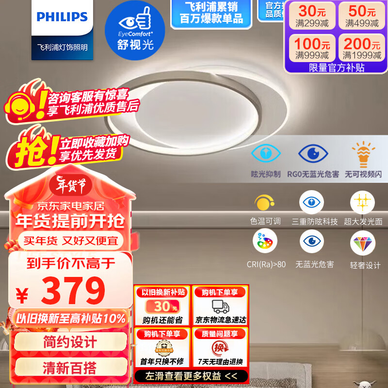 飞利浦(PHILIPS)LED吸顶灯客厅灯简约客厅卧室灯饰灯具环慕45W砂砾灰 9290033001价格:579.00元!
