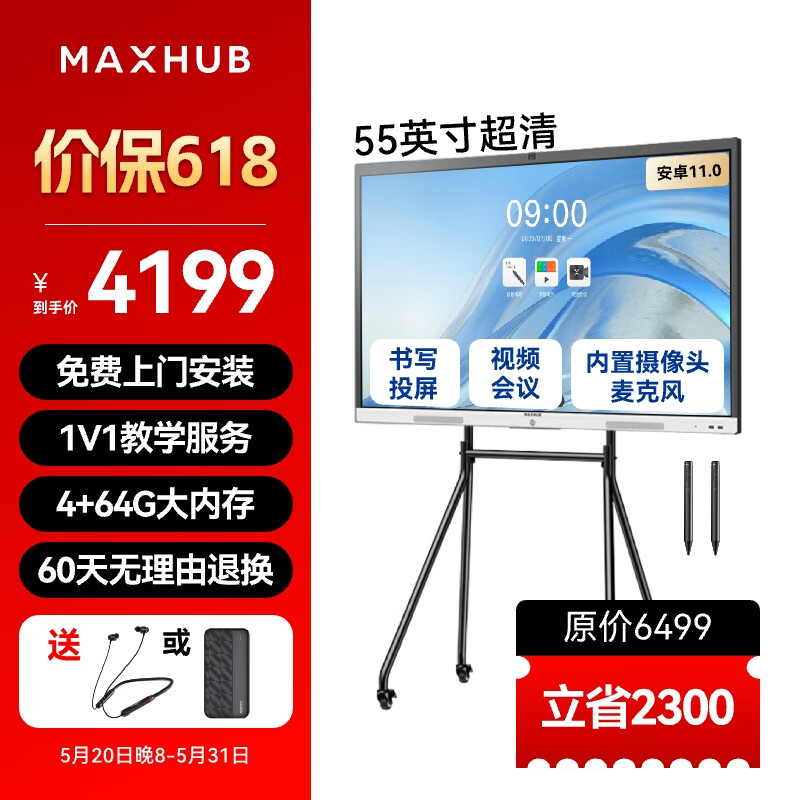 maxhub视频会议平板教学一体机触屏书写无线投屏内置会议摄像头麦克风会议电视V6新锐E55+时尚支架价格:4999.00元!