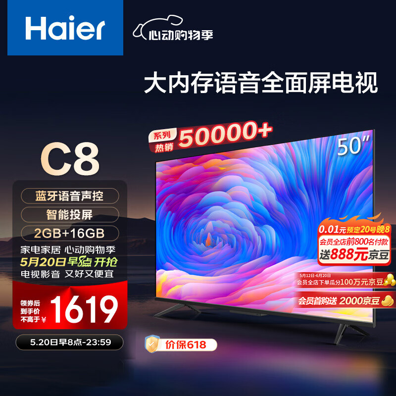 海尔(Haier)LU50C8 50英寸4K屏幕智能音画质客厅平板液晶电视机家用彩电AI远场语音2+16G以旧换新55价格:1619.00元!