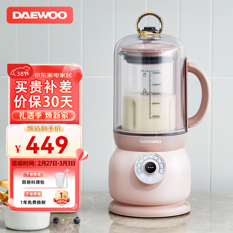 大宇(DAEWOO)破壁机低音豆浆机迷你全自动免手洗搅拌机营养调理机家用FP02樱花粉价格:449.00元!