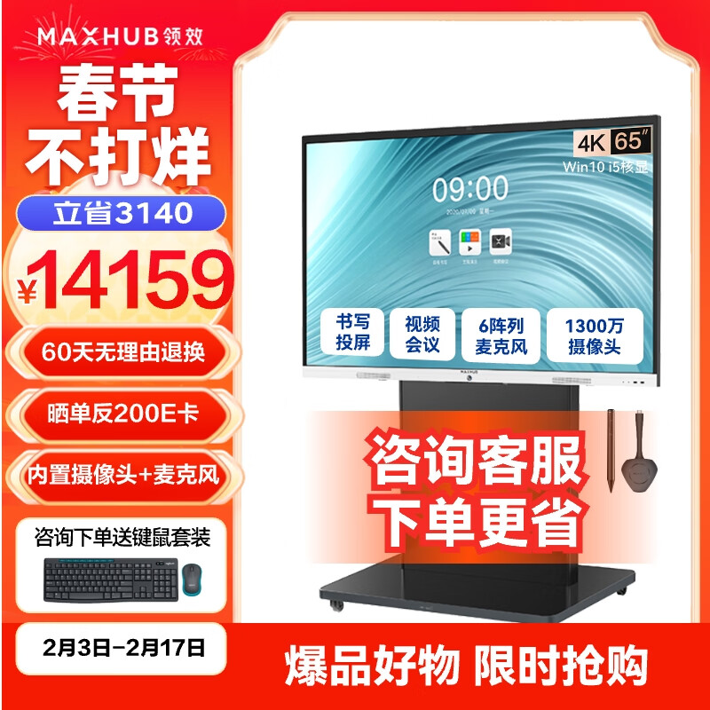 maxhub视频会议平板一体机教学触控书写投屏内置摄像头麦克风新锐Pro65 Win10+商务支架+传屏+笔价格:14159.00元!