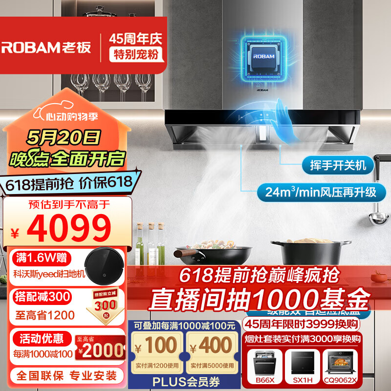 老板(Robam)【李佳琦直播间同款】油烟机60X6S变频双腔24立方风量1000Pa强劲静压挥手智控大吸力抽油烟机 搭配5.2kW天然气灶60X6S+57B0X 天然气价格:4699.00元!