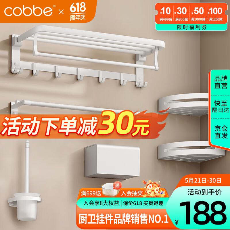 卡贝(cobbe)太空铝毛巾架浴室壁挂免打孔卫生间置物架洗手间浴巾架五金挂件价格:218.00元!