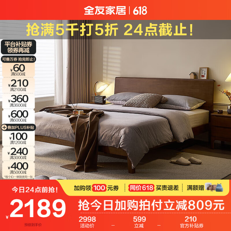 全友家居 胡桃木色实木多功能现代简约主卧室双人大床1.8x2米DW1201价格:2998.75元!
