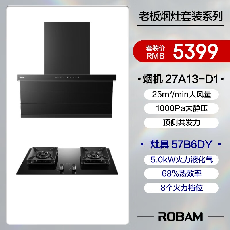 老板(Robam)油烟机家用顶侧双吸抽油烟机大吸力25风量一级能效侧顶吸油烟机家用燃气灶27A13-D1+57B6D液化气价格:5899.00元!