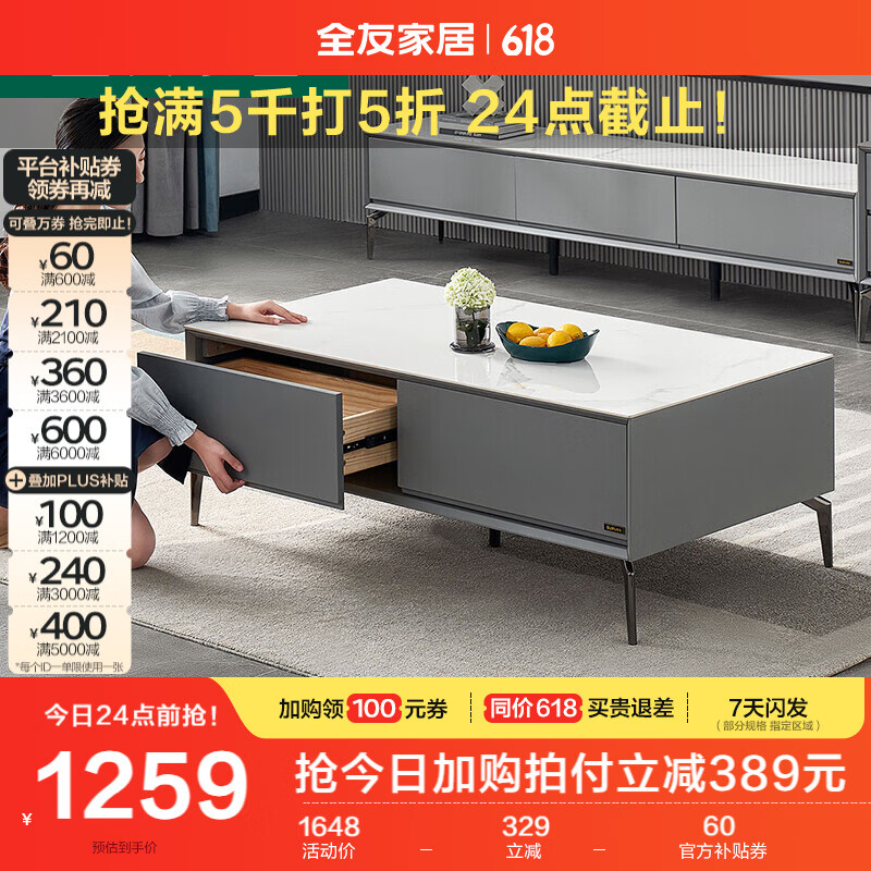 全友家居 茶几意式风格岩板茶几环保板材双向四抽客厅储物家具DW1055H价格:1648.75元!