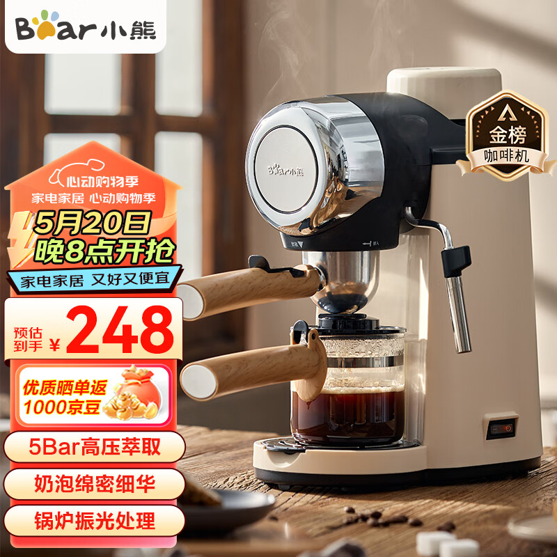 小熊(Bear) 咖啡机家用意式半自动 小型5Bar泵压式高压萃取 花式浓缩咖啡蒸汽奶泡冲泡一体 拿铁咖啡新年礼物 米白色 KFJ-A02R2价格:289.00元!