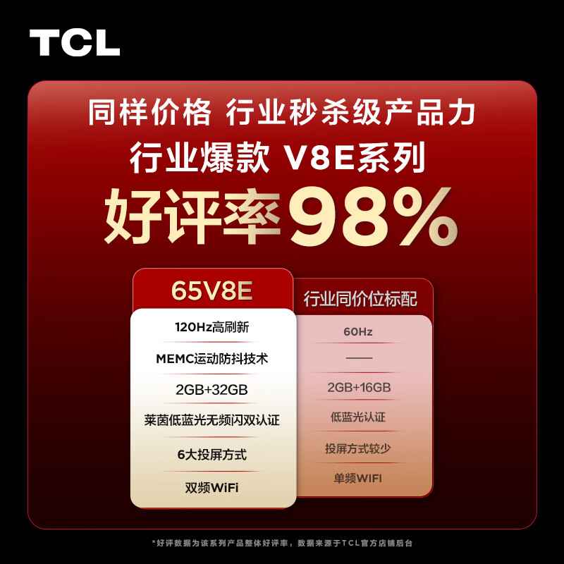 TCL电视 65V8E 65英寸 120Hz 2+32GB MEMC运动防抖 平板电视机 以旧换新价格:2599.00元!