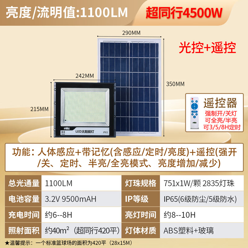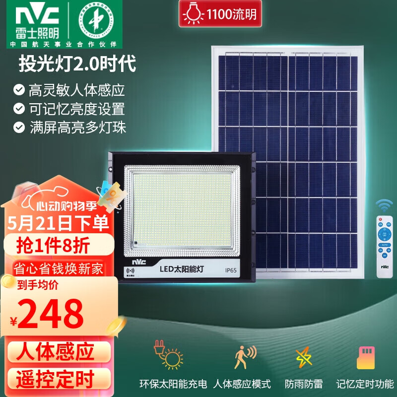 雷士(NVC)太阳能灯庭院灯路灯户外室外防水灯人体感应+遥控1100lm+照约28㎡价格:309.00元!