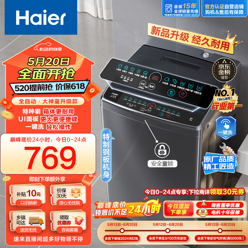 海尔(Haier)波轮洗衣机小型全自动家用 8公斤 桶自洁 宿舍出租房神器 以旧换新 原厂品质EB80M30Mate1价格:799.00元!