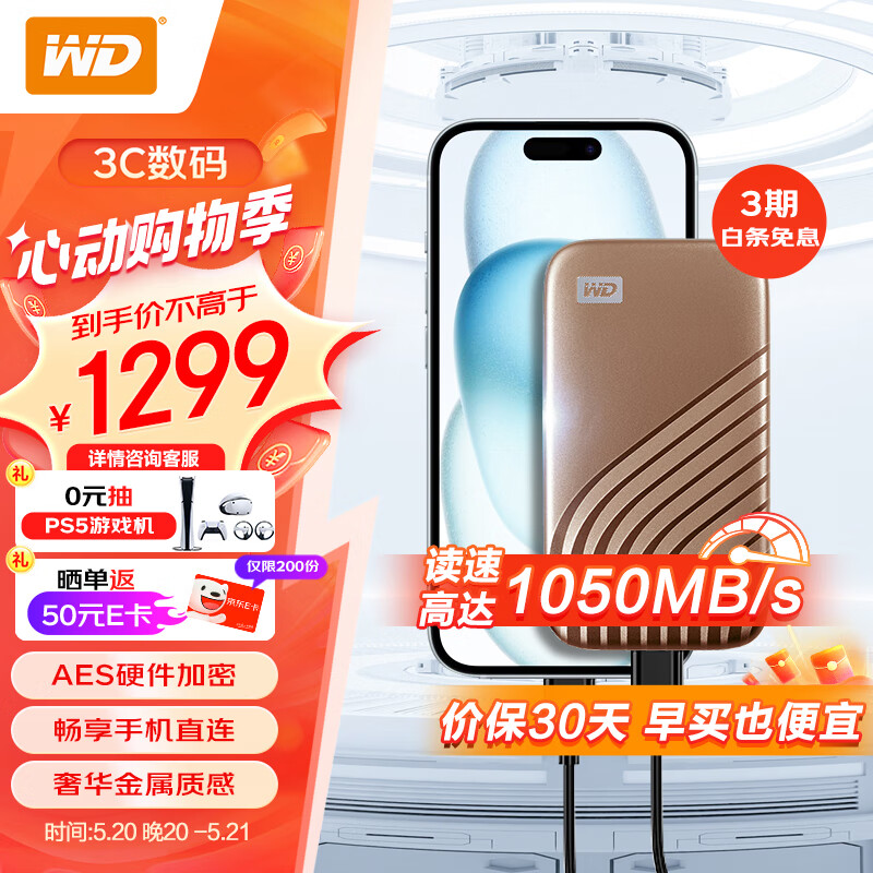 西部数据(WD)2TB NVMe 移动固态硬盘(PSSD)My Passport随行SSD type-c接口 1050MB/s 手机直连笔记本外接价格:1299.00元!