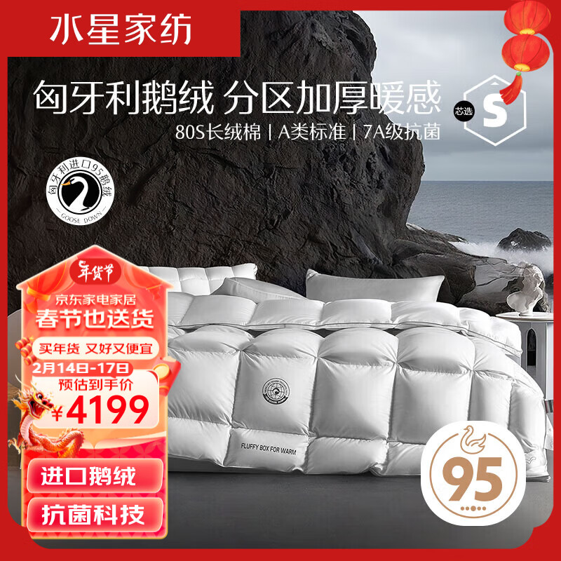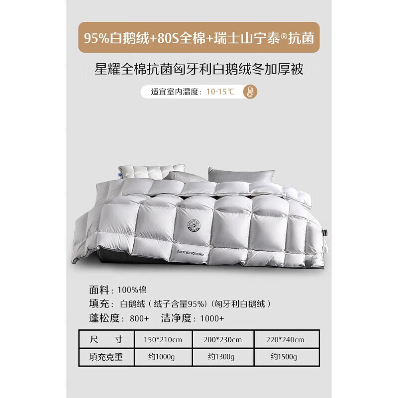 水星家纺A类95%白鹅绒进口匈牙利羽绒被加厚冬被(1500g填充)220*240cm价格:8199.00元!
