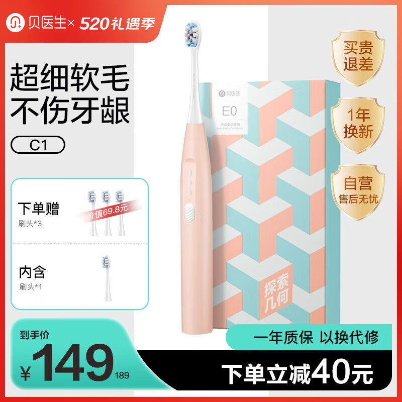 贝医生(DR·BEI) 电动牙刷成人声波震动智能软毛牙刷情侣款防水全自动牙刷充电式C1 洗漱旅行套装 国货520礼物 E0 粉色价格:149.00元!