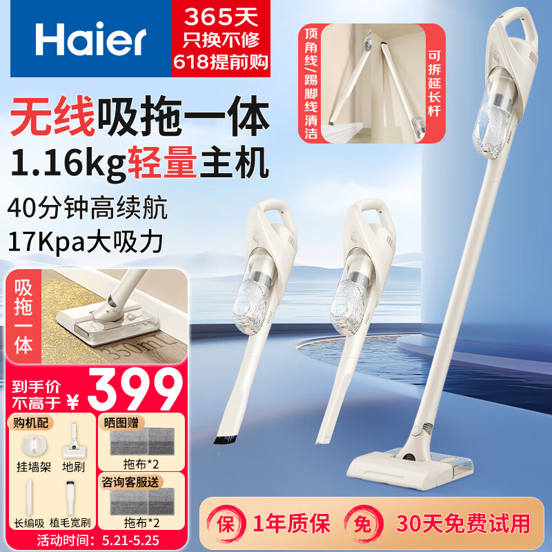 海尔(Haier)无线吸拖一体吸尘器家用轻量宠物便携式除尘机大功率大吸力干吸湿拖多用HZG-Q49W价格:349.00元!