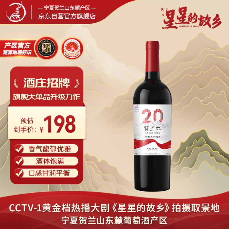 贺兰红宁夏贺兰山东麓赤霞珠干红葡萄酒2.0升级款国产红酒750ml单瓶价格:222.00元!
